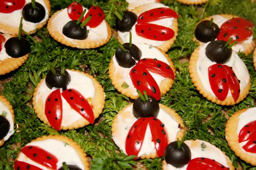 Для начала нужно украсить тарелку, на которой будут подаваться закуски, петрушкой или укропом. Сверху выкладываем крекеры, смазанные плавленым сыром. Нарезаем помидоры тонкими дольками, имитируя крылья божьей коровки. Из кусочка маслины выкладываем голову и точечки на крыльях. Усики можно сделать из стеблей петрушки или укропа.