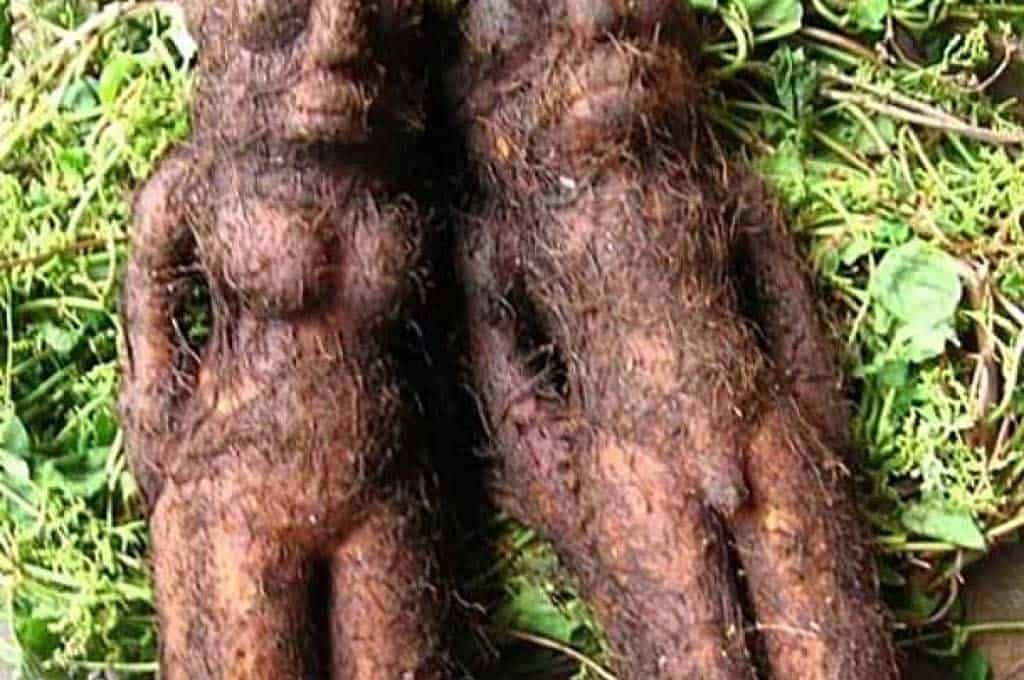 Всеобщему обозрению представляются несуразные «картофелины», напоминающие человеческие тела. Причем со всеми очертаниями конечностей и половыми признаками. Эдакие инопланетные гуманоиды, зашедшие в гости «на огонек». Такое странное строение корневой системы объясняется средой произрастания растения. Вернее, каменистой почвой, сквозь которую корням очень трудно пробраться. В итоге корнеплоды получаются извилистые и продолговатые. После выкапывания их режут, сушат, настаивают на спирту, стирают в порошок и еще «истязают» десятком способов для изготовления всевозможных лекарственных средств.
