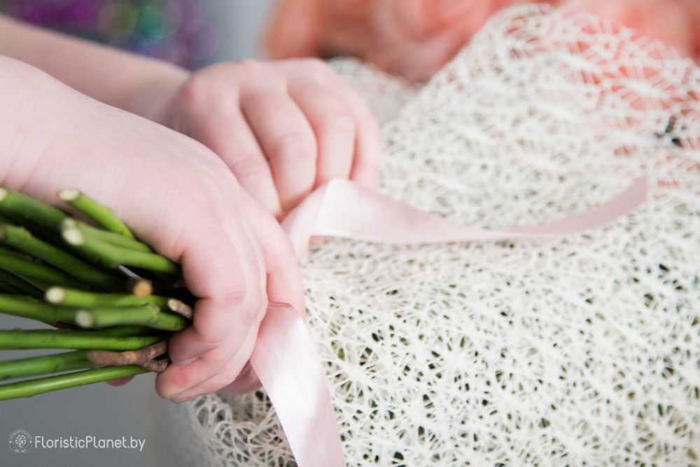 Чтобы придать объем букету, собирают его по спирали, нижнюю часть стеблей при этом разводят как можно шире. И только после связки стеблей, композицию оформляют в упаковку.