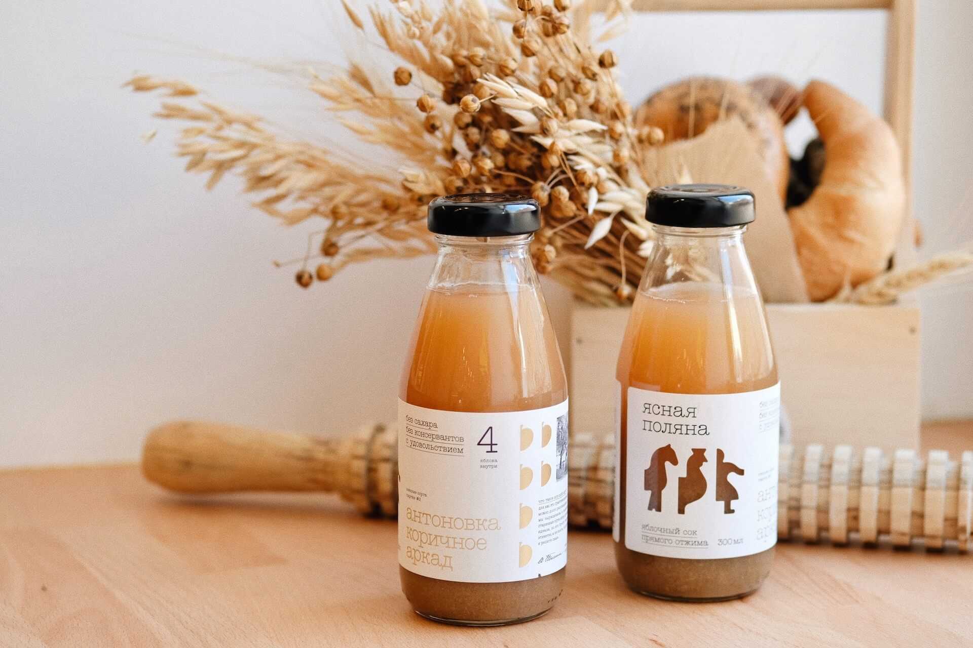 Сначала был начат выпуск сока прямого отжима. «Творческий процесс» был запущен, для производства сока использовались сочетания яблок разных сортов. Получались очень необычные вкусы. На этикетках можно увидеть фигурки – это лошадь, женщина, петушок. Такие были на резной веранде, где семья Толстых любила пить чай. Шрифт, которым набраны слова «Ясная Поляна» повторяет тот, что был на печатной машинке Толстого.