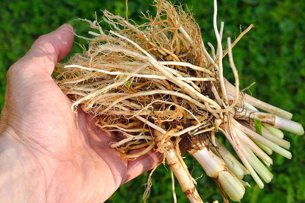 Потом корневища следует разложить на проволочной сетке в помещении, где они будут сушиться на протяжении 14 дней, при этом их нужно регулярно переворачивать. Для сушки корней можно воспользоваться духовым шкафом либо сушилкой, при этом выставляют температуру от 35 до 40 градусов, этот способ позволит сберечь вам драгоценное время. Высушенные корни становятся бурыми и имеют резкий специфический запах. После того как 1 кг корневищ полностью высохнет, он будет весить около 0,2 кг.