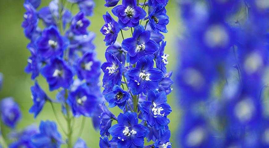 - Дельфиниум – в период цветения на растении раскрываются пурпурные, небесно-голубые, белые, синие и розовые венчики.