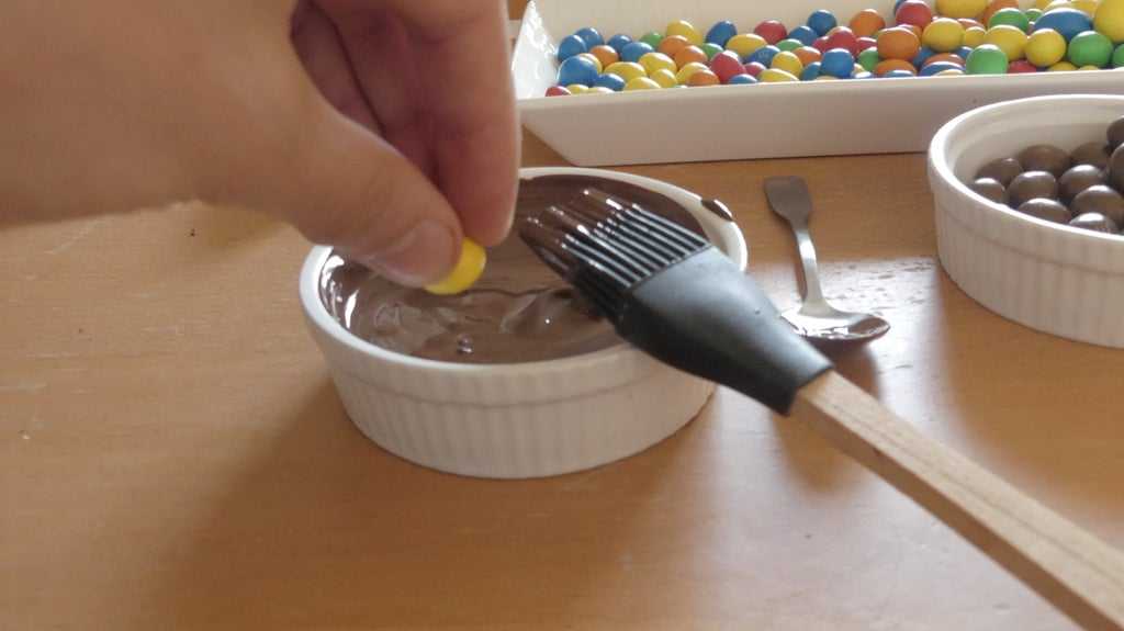 9) Осторожно кисточкой для пасты нанесите на дюбели еще растопленного шоколада и приклейте к нему оставшиеся сладости. Вам не нужно беспокоиться о покрытии верхней части