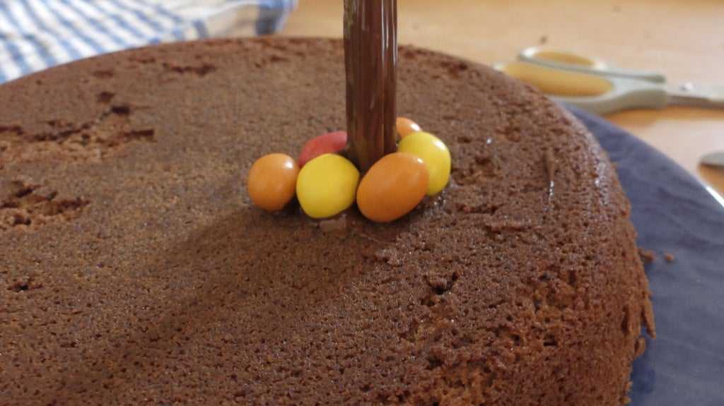 Оставьте для застывания, а затем поместите пустой мешок из-под конфет поверх дюбеля, чтобы создать иллюзию, что конфеты падают на торт.