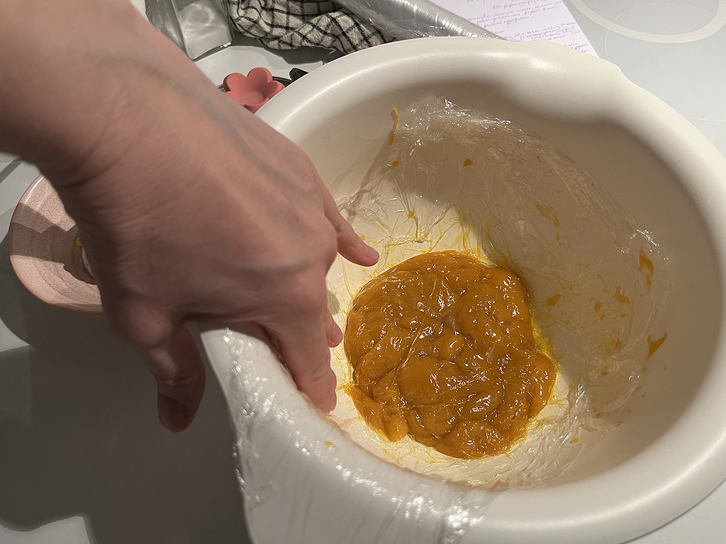 - 20 г кукурузного крахмала разводят в 30 г воды и, влив в массу, перемешивают. Когда загустеет, снимают с огня и остужают.