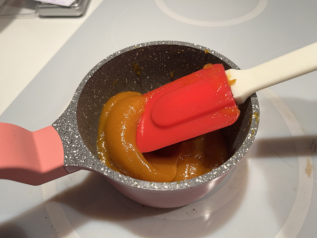 Горячую персиковую смесь вылить в чашу с высокими бортами, туда же влить вторую часть кокосового масла и пробить до однородности погружным блендером.