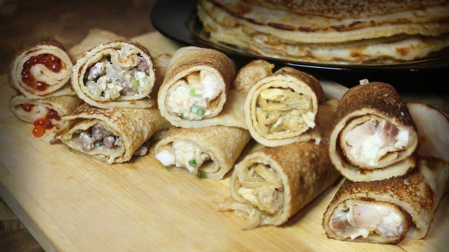 Сытные и аппетитные блинчики получаются при использовании мясных, рыбных, грибных, яичных или овощных начинок. Для этого продукты доводят до готовности, измельчают и наполняют блины. Их можно употреблять в холодном виде, но особенно они вкусны горячими, приправленными сметаной или соусом.