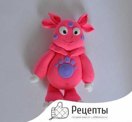 - При помощи ушной палочки и насыщенного пурпурного красителя (как на мордочке) следует поставить пятнышки на животике Лунтика. Фигурка готова!
