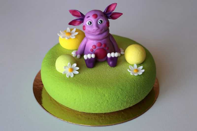 Детский торт в виде Лунтика можно приготовить по классическому рецепту из бисквита с фруктовой начинкой. После выпекания вырезать подходящую форму острым ножом, а декорировать с помощью мастики.