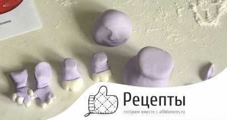 Например — разделив сразу по необходимому объёму мастику на части. Допустим: немного оставить белой мастики, большую часть мастики окрасить в розовый цвет и ещё немного фиолетового. Для глазок нам нужно совсем небольшую часть чёрной мастики. Конечно её можно просто потом окрасить перед непосредственной укладкой глаз (оформления Лунтика). Готовую вымешанную мастику мы отправляем в холодильник минимум на 1-2 часа.