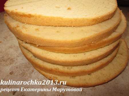 Сначала разрезаем испечённые бисквитные коржи. Екатерина предлагает разделить каждый корж на 3 части. Всего получается 6 коржей.