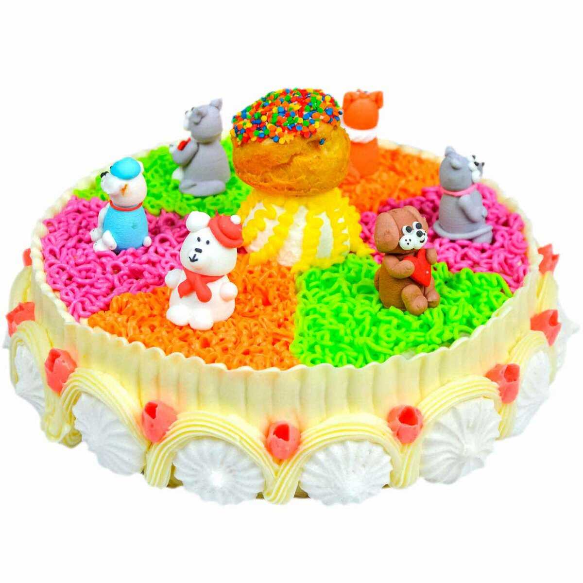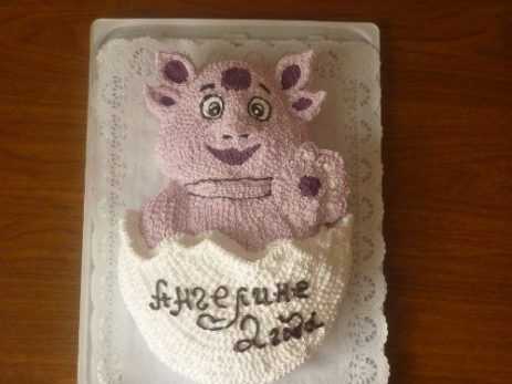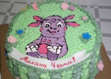 Из полученного крема с помощью различных насадок кондитерского шприца следует сделать основу – полностью покрыть торт. Нарисовать контуры Лунтика и внутри заполнить цветным кремом, прорисовывая остальные элементы.