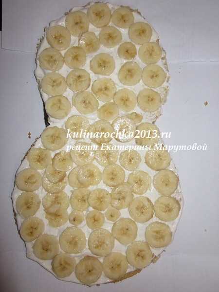 Затем мы будем формировать (лепить) личико и животик Лунтика, делая их выпуклыми. Уложенный первый слой бисквитного коржа пропитываем сиропом. Затем промазываем корж сметанно-творожным кремом и укладываем слой нарезанных бананов.