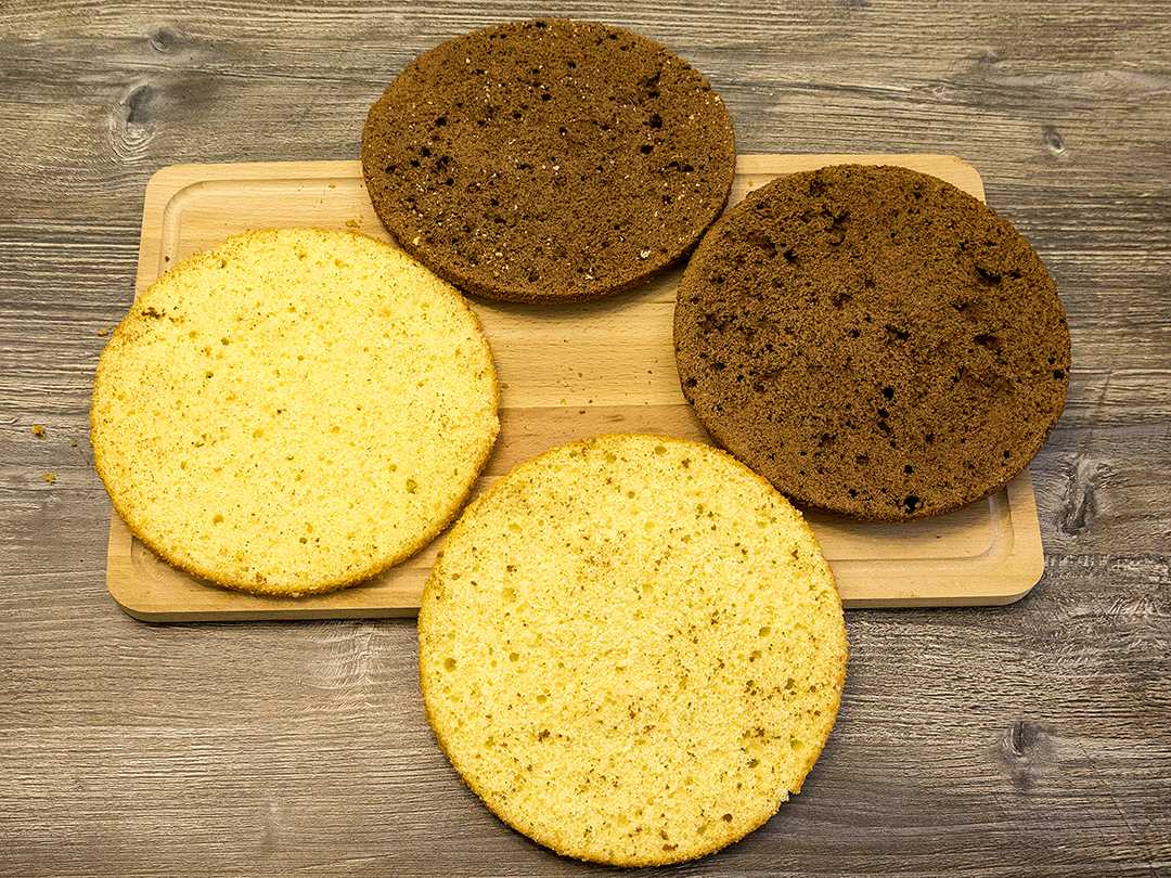 Круглую форму для выпекания застилают бумагой для выпекания и обрабатывают растительным маслом. Темные и светлые коржи выпекают отдельно.