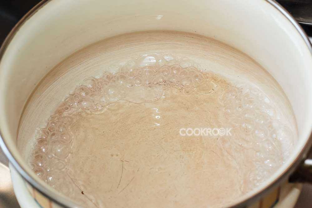 - Отдельно вливаем воду в кастрюлю, соединяем с растительным маслом и доводим до кипения, после чего отправляем к сухой смеси и начинаем вымешивать пока она не станет достаточно плотной.