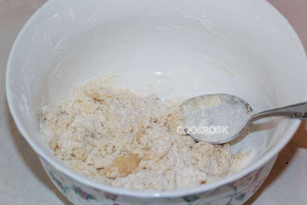 - Сюда же отправьте гашенную лимонным соком соду и крахмал.
