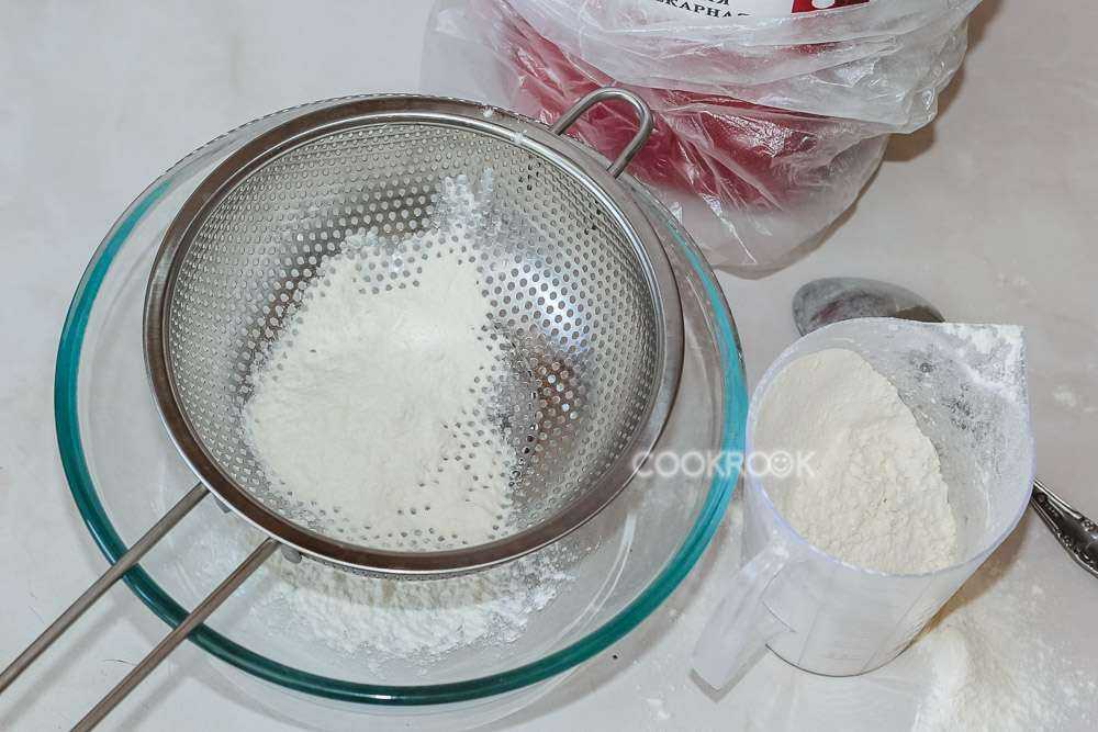 Муку просеять в чашу, добавить крахмал, соль, разрыхлитель и ванилин.