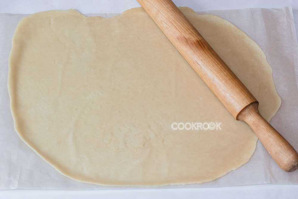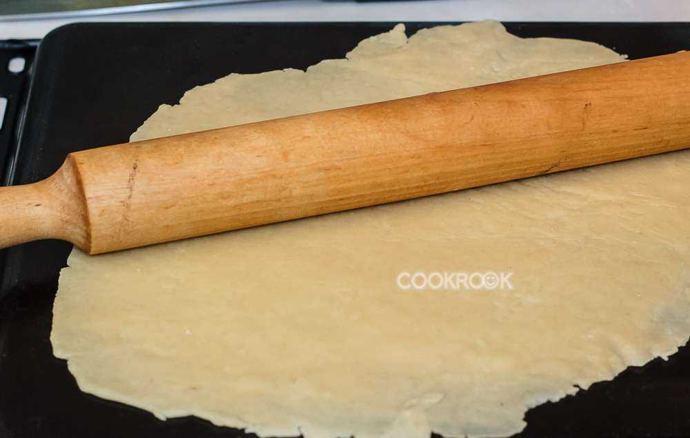 - Тесто раскатать до толщины 3 миллиметра, перенести его на смазанный маслом противень.