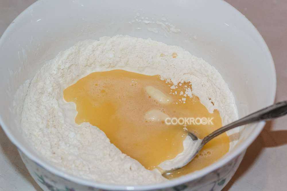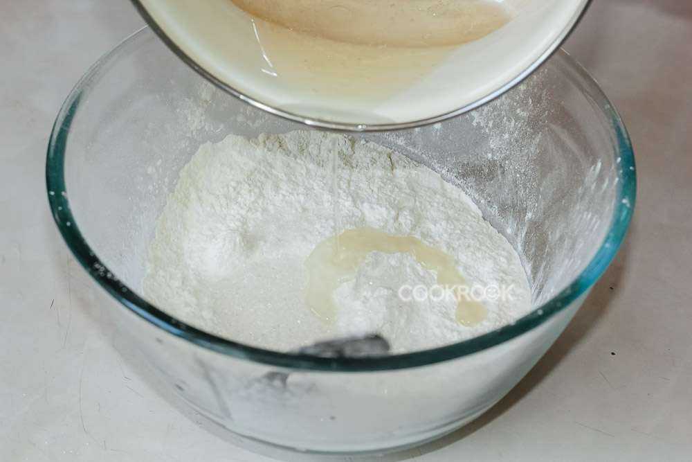 - Всыпьте в емкость с жидкостью муку, хорошенько перемешав массу.