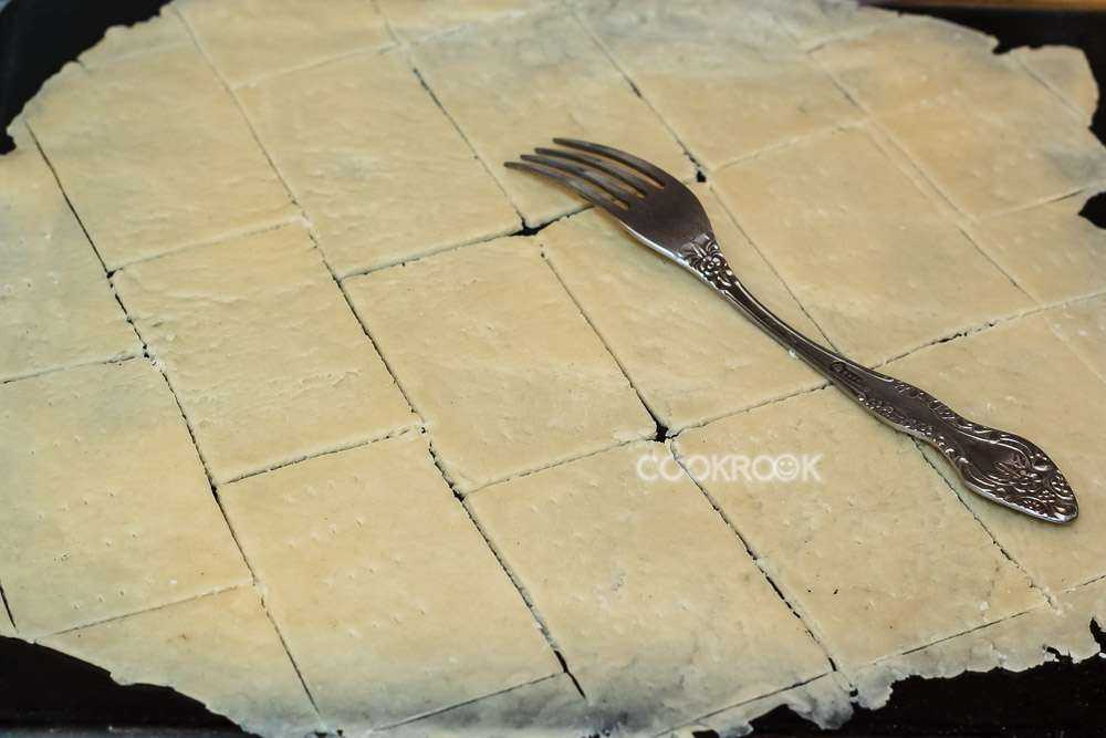 - Сделать на заготовках несколько проколов вилкой, чтобы все хорошо пропеклось, выложить на противень и держать около шести минут на 200 градусах в заранее прогретой духовке.