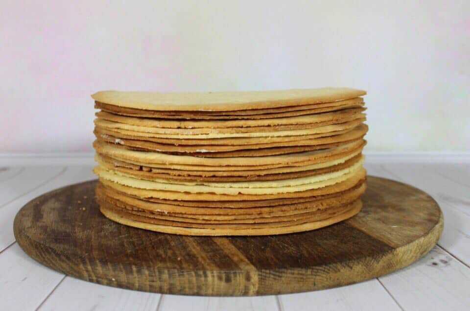- Для этого каждый полученный отдельный кусочек теста необходимо раскатать в корж единого диаметра, по кругу, если необходимо обрезать края, они должны получиться ровными.