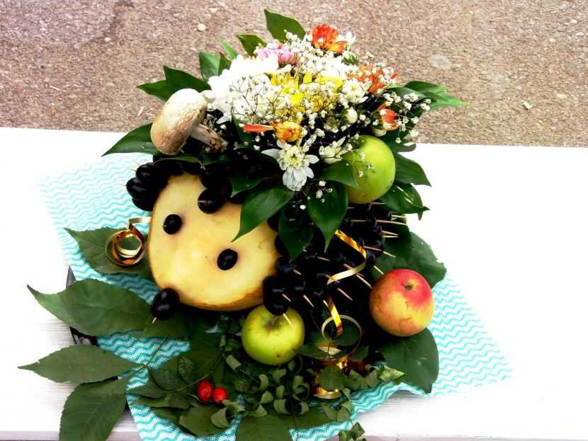 Материал для колючек можете выбрать сами. Ими могут быть семечки подсолнечника, спички, половинки зубочисток, кусочки самого яблока и др. Украсьте вашего ежа, положив на колючки ягоды, грибы из пластилина, виноградинки. Так ваш еж будет смотреться реалистичнее и интересней.
