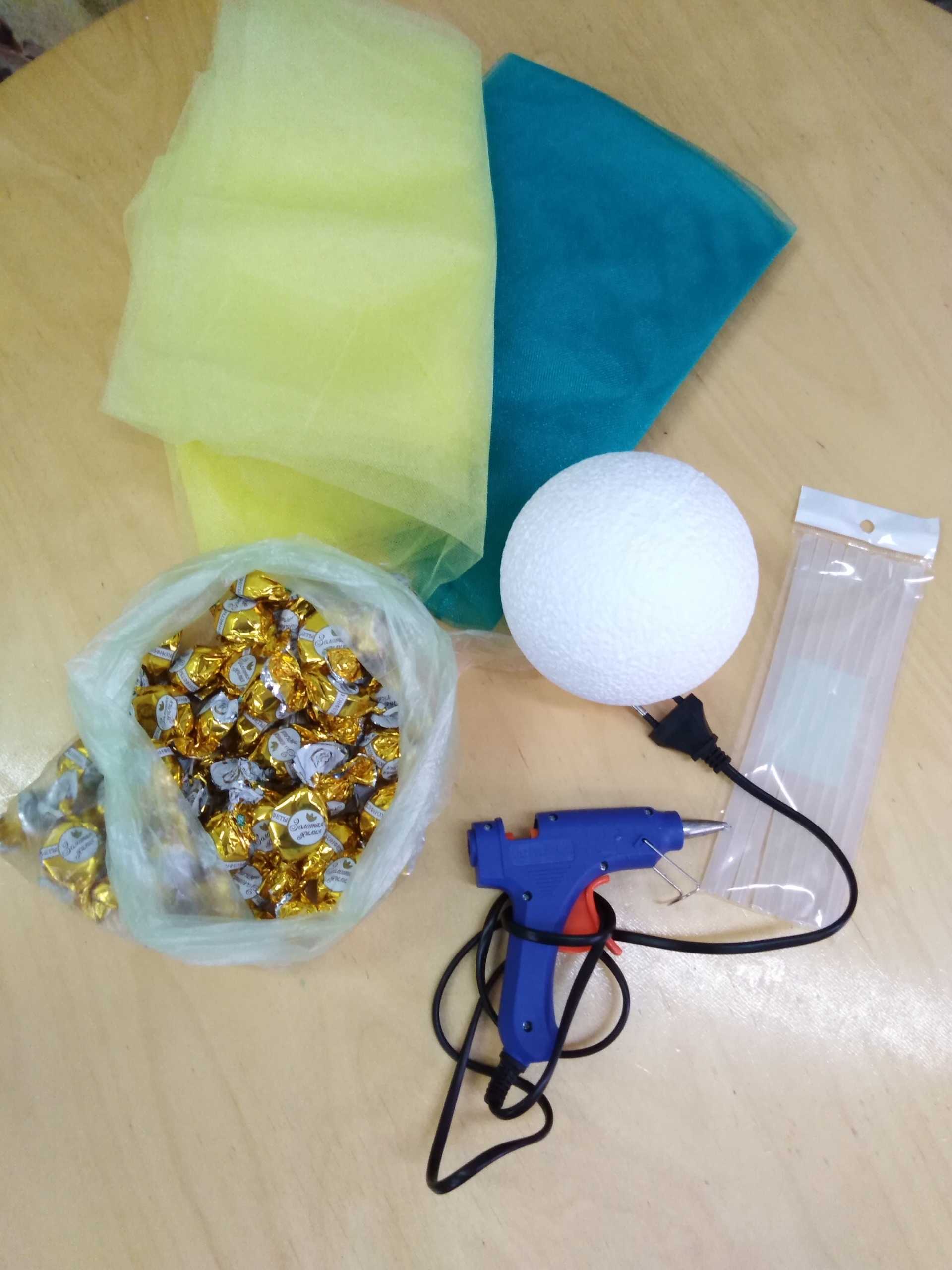 Когда конфеты подготовлены, можно приступать к оклеиванию ими шара.