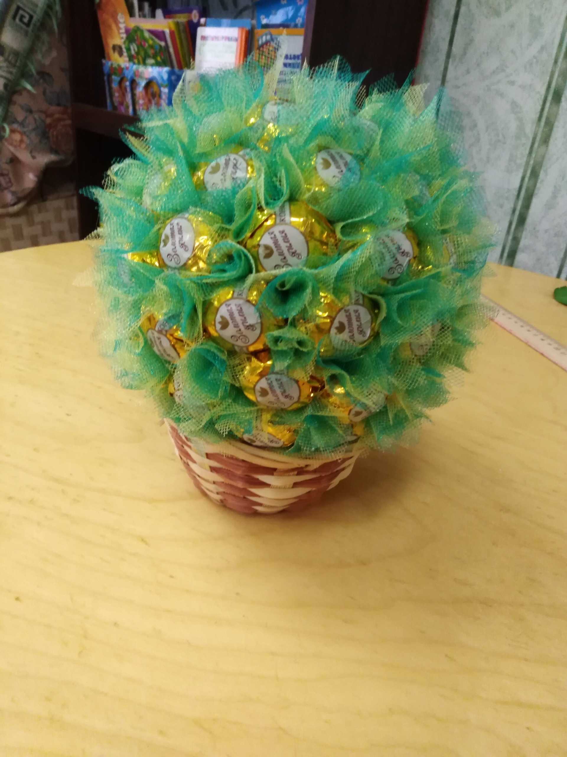 - Основа. В качестве днища, на которое выкладывают задекорированные конфеты, используют корзины разных форматов и размеров, пенопластовые блоки, декоративные вазы;