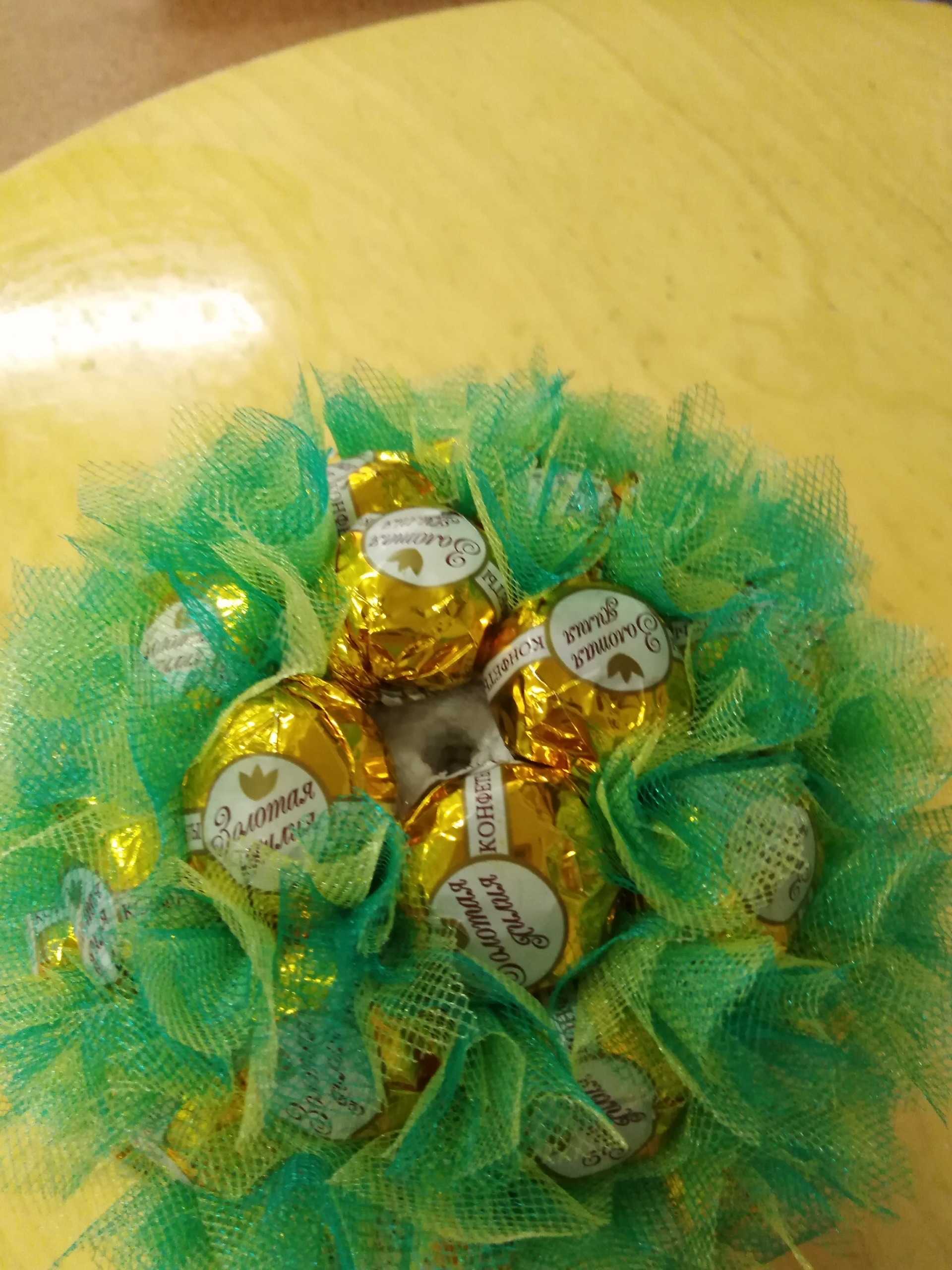 Приклейте его, например, в маленькую корзиночную основу. Добавьте несколько цветов с конфетами, задекорируйте сизалем или мишурой (если это новогодний вариант), или фунтиками. И вот, что у вас может получиться.