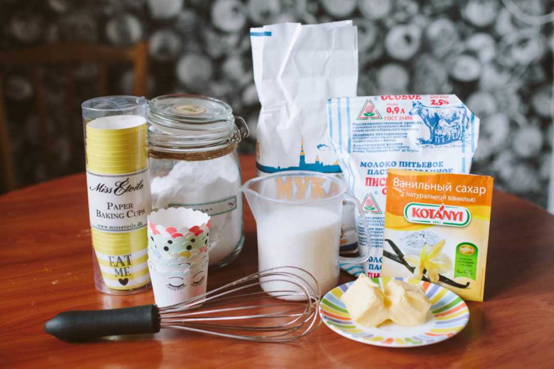 Ингредиенты для приготовления капкейков достаточно просты, их несложно найти на прилавках продуктового магазина. Это пирожное готовится из классического бисквитного теста. Ингредиенты классического капкейка: