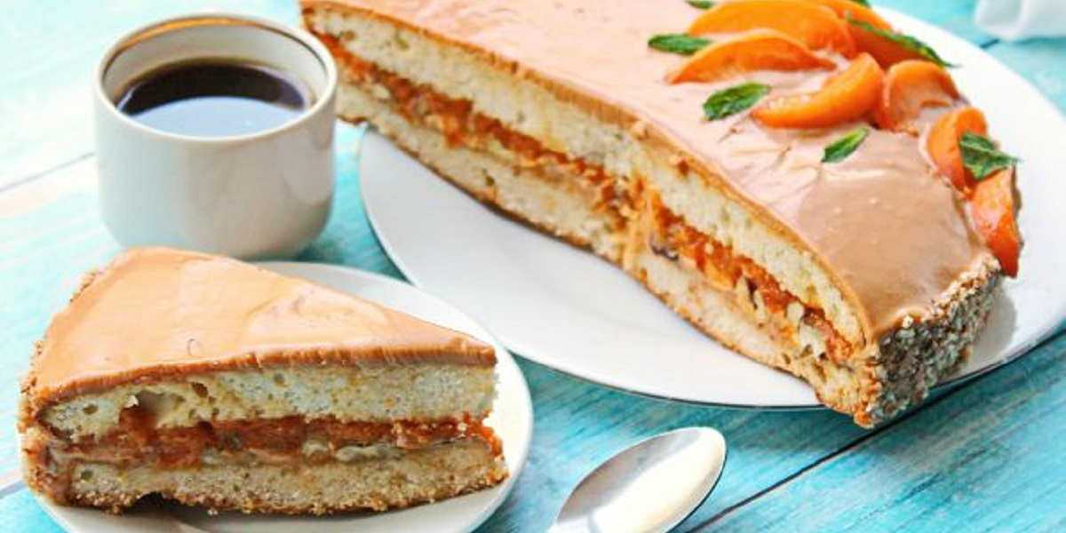- 5 Извлеките бисквит из формы и разрежьте его вдоль на два коржа. Обе половинки смажьте мёдом, подогретым с 50 мл воды. Сторону среза верхней части смажьте пюре их кураги.