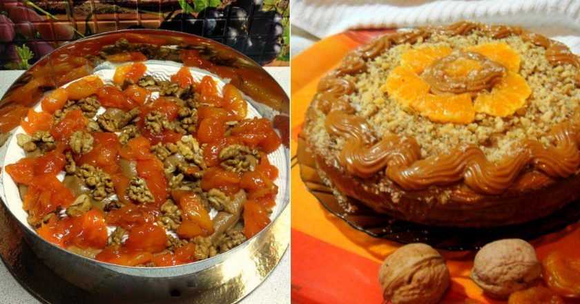 Сборка: пропитанный сиропом корж покрыть кремом, посыпать орехами, покрыть прослойкой из кураги или чернослива.