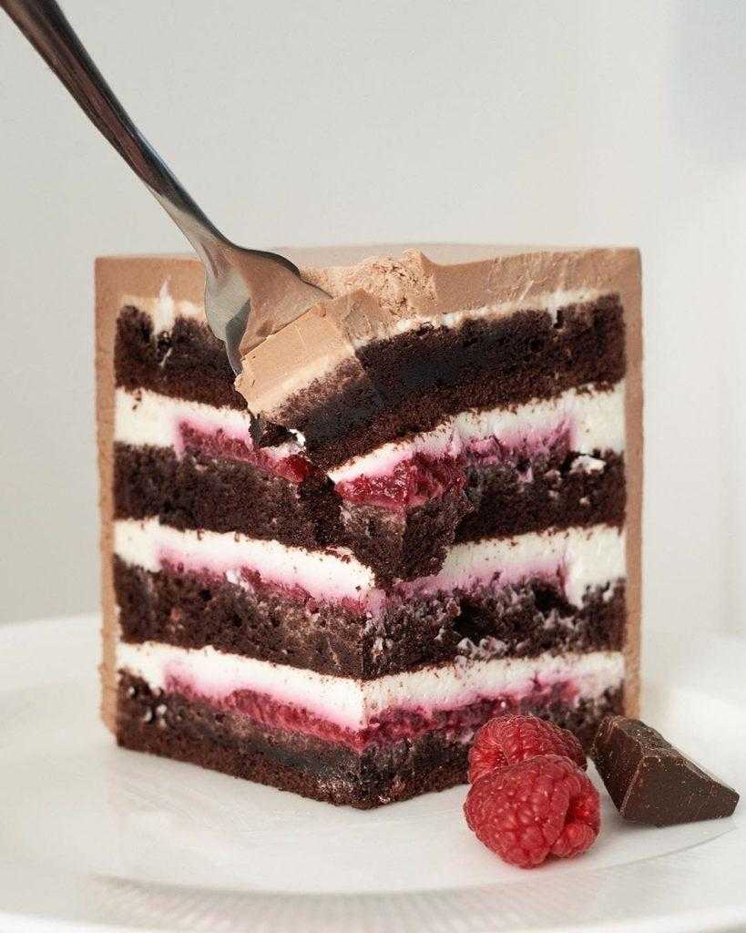 Если такой торт нужно нарезать для фото, то в качестве куска лучше использовать сразу четверть торта. Так, кусок сможет ровно стоять на тарелке или лопатке.