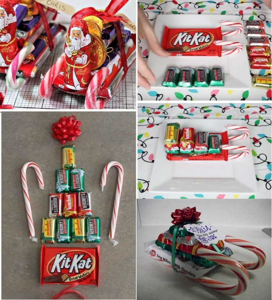 Леденцы будут первым рядом. Их закругленные части должны смотреть вверх, словно полозья у саней. Далее кладется большая шоколадка, затем поменьше и сверху две конфеты (это могут быть и маленькие шоколадки или другие сладости). Все это нужно перевязать лентой, чтобы ничего не распадалось. Дополнить саночки можно небольшим шоколадным Дедом Морозом.