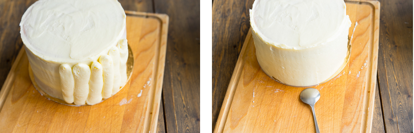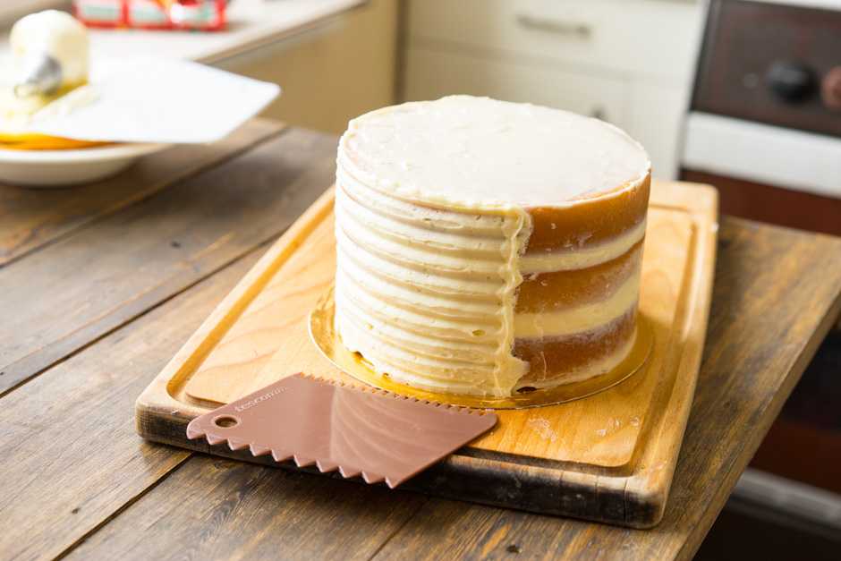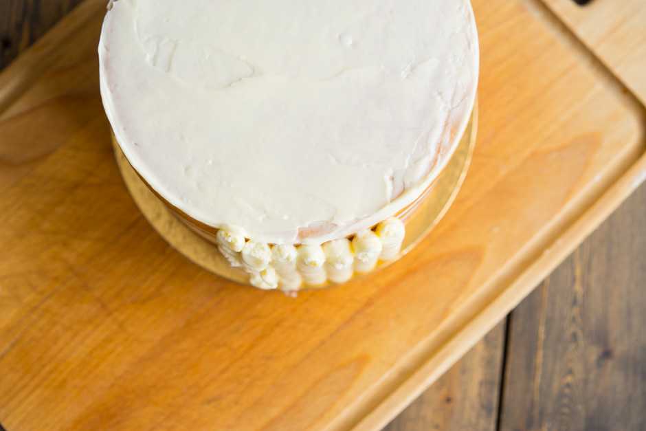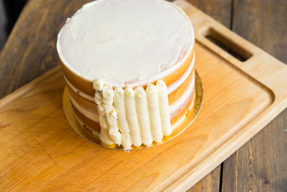 Самый удобный и быстрый способ покрыть торт кремом — это сделать полоски крема снизу вверх, используя насадку мешка (или срезанный носик).