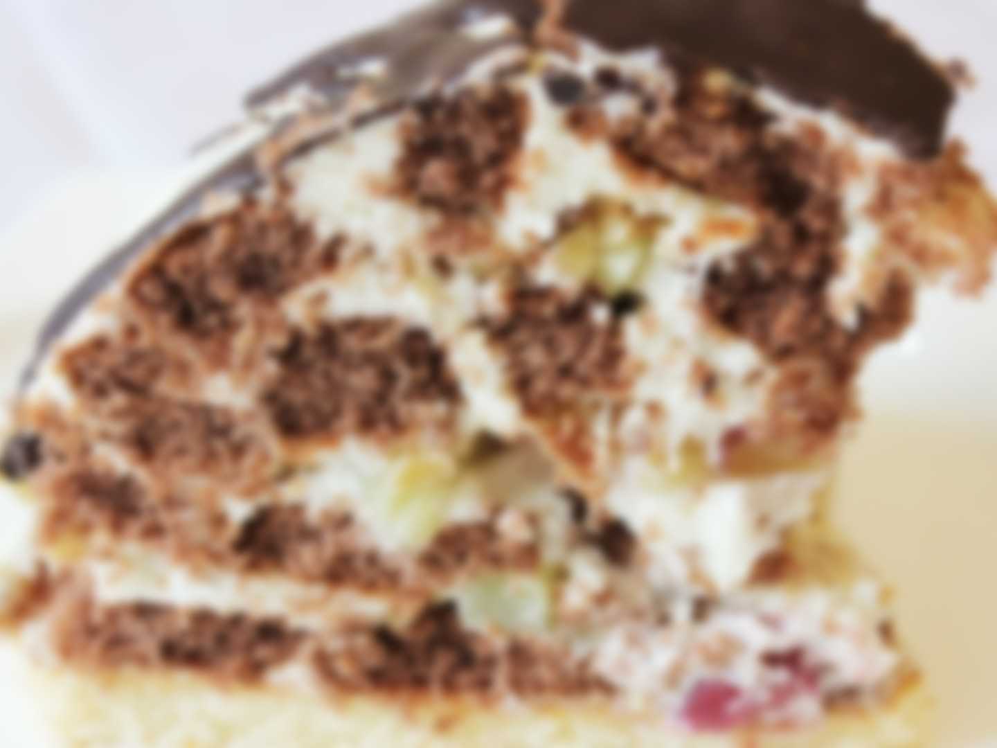 - Каждый кубик бисквита следует опустить в крем, а затем уложить их на нижний слой, постепенно создавая весьма ровную горку, то есть, сужая кверху. Всю вторую половину орехов и ананасов следует разделить еще раз поровну, после чего их следует еще раз выложить слоем на кубиках коржа. Оставшимися бисквитными кубиками необходимо создать вершину горы, которая вновь посыпается той же начинкой. После этого торт следует залить очень большим количеством крема, а затем полить шоколадной глазурью;