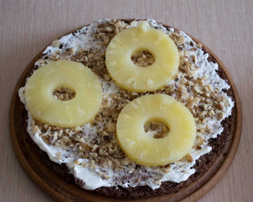 На смазанный сметанным кремом корж выкладываем половину порезанных ананасов и половину орехов.