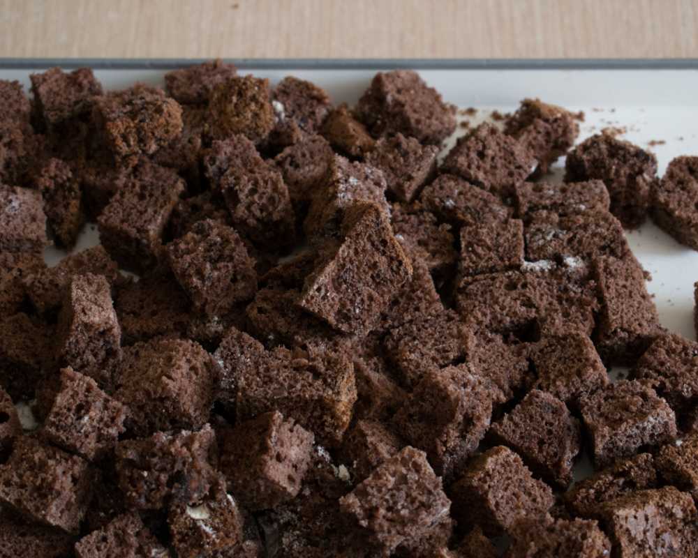 Верхнюю часть разделим на крупные бисквитные кубики примерно размером до 3 см.