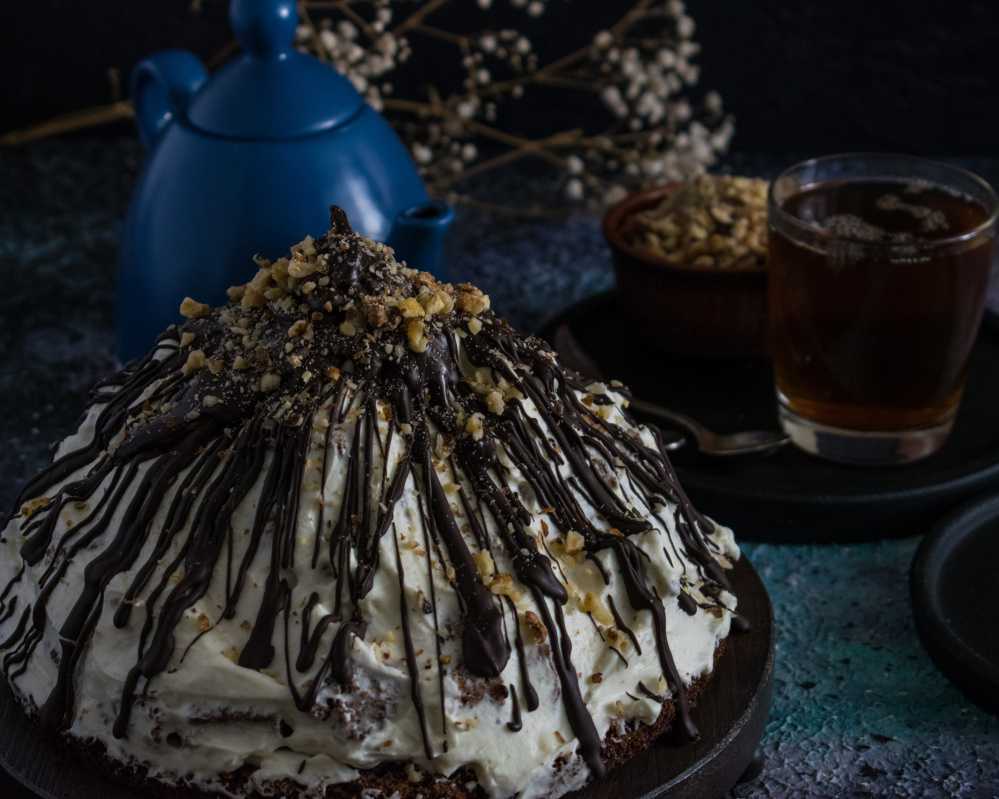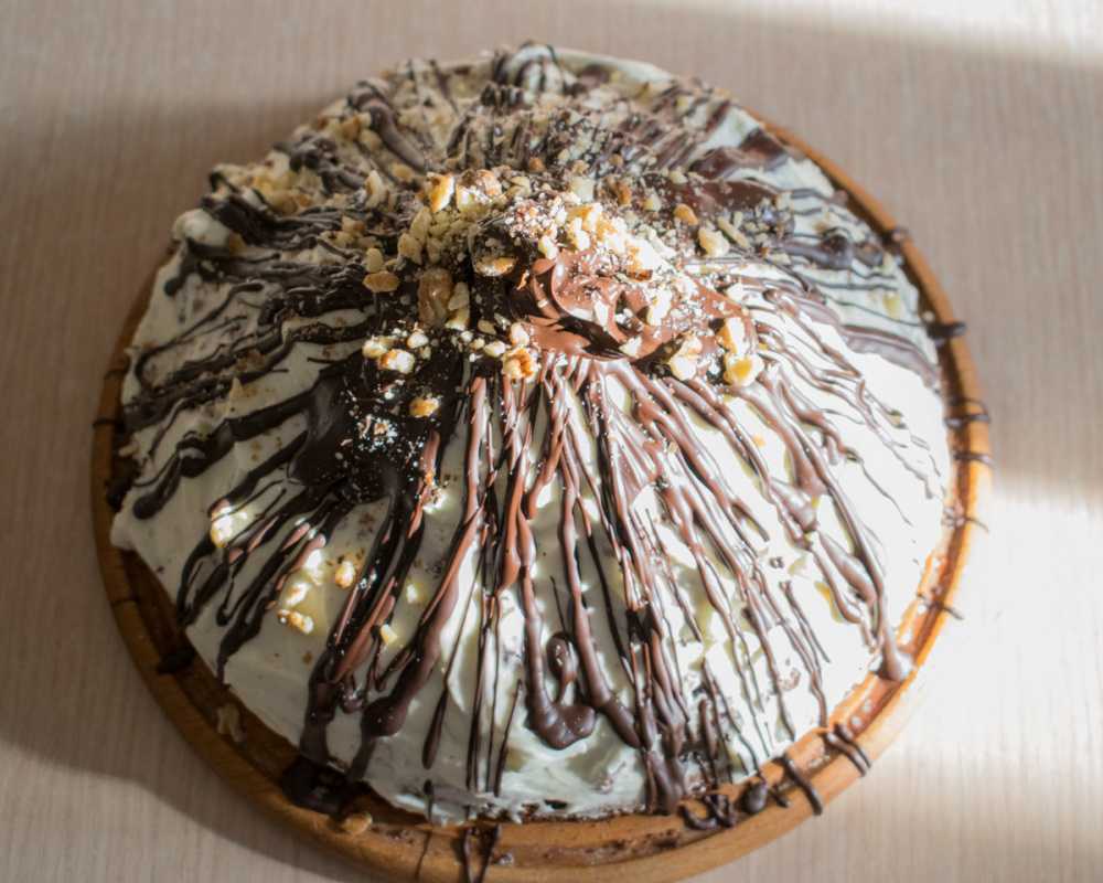 - Заливаем сверху оставшимся кремом и украшаем растопленным на водяной бане шоколадом, просто поливая тонкой струйкой из чашки.