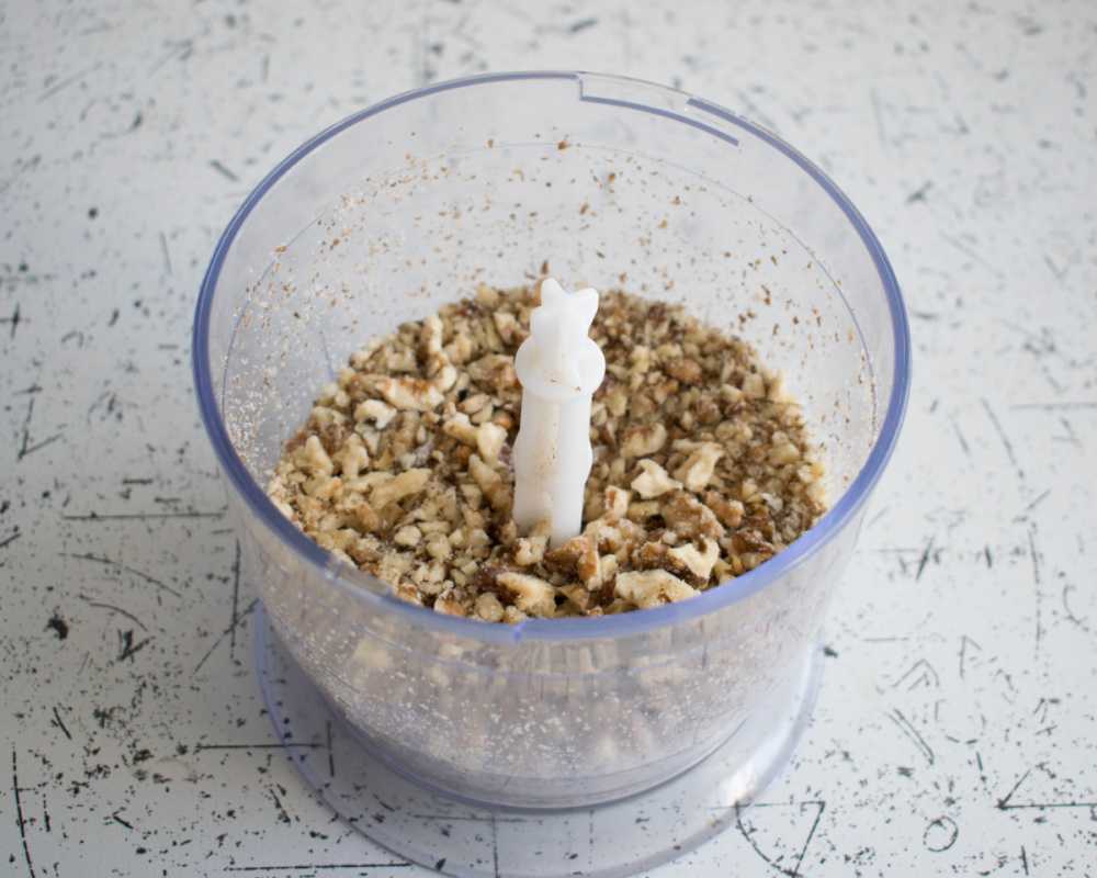 Стакан чищеных грецких орехов измельчаем при помощи ножа.