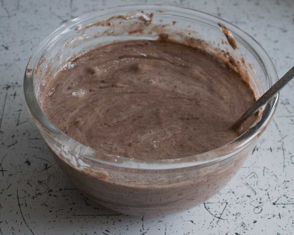 - Снова повторяем процедуру замешивания бисквита, но на сей раз берем немного меньше муки и добавляем какао-порошок. В любом случае, должна получиться одна мульти-чашка.