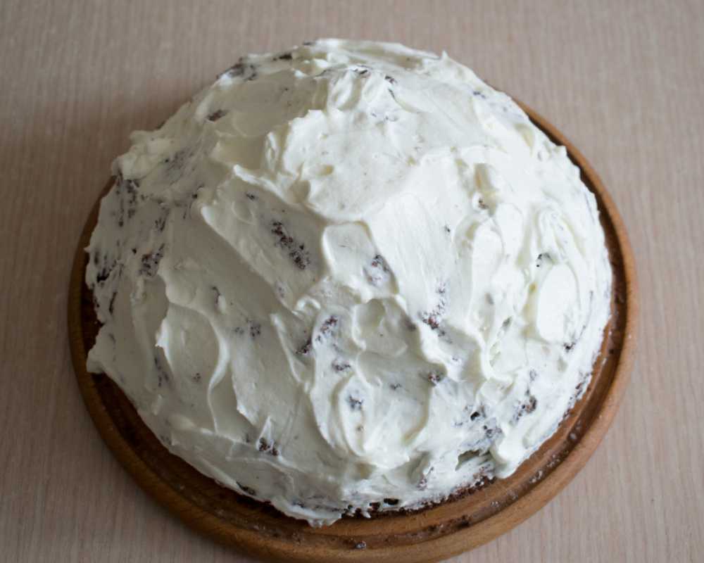 Со всех сторон промазываем торт кремом, формируя практически правильную горку.