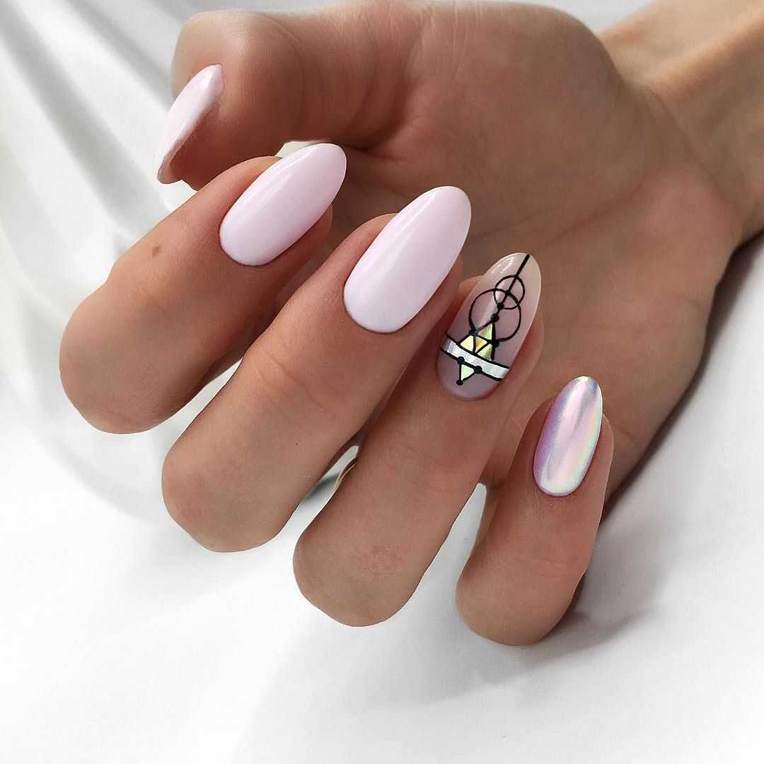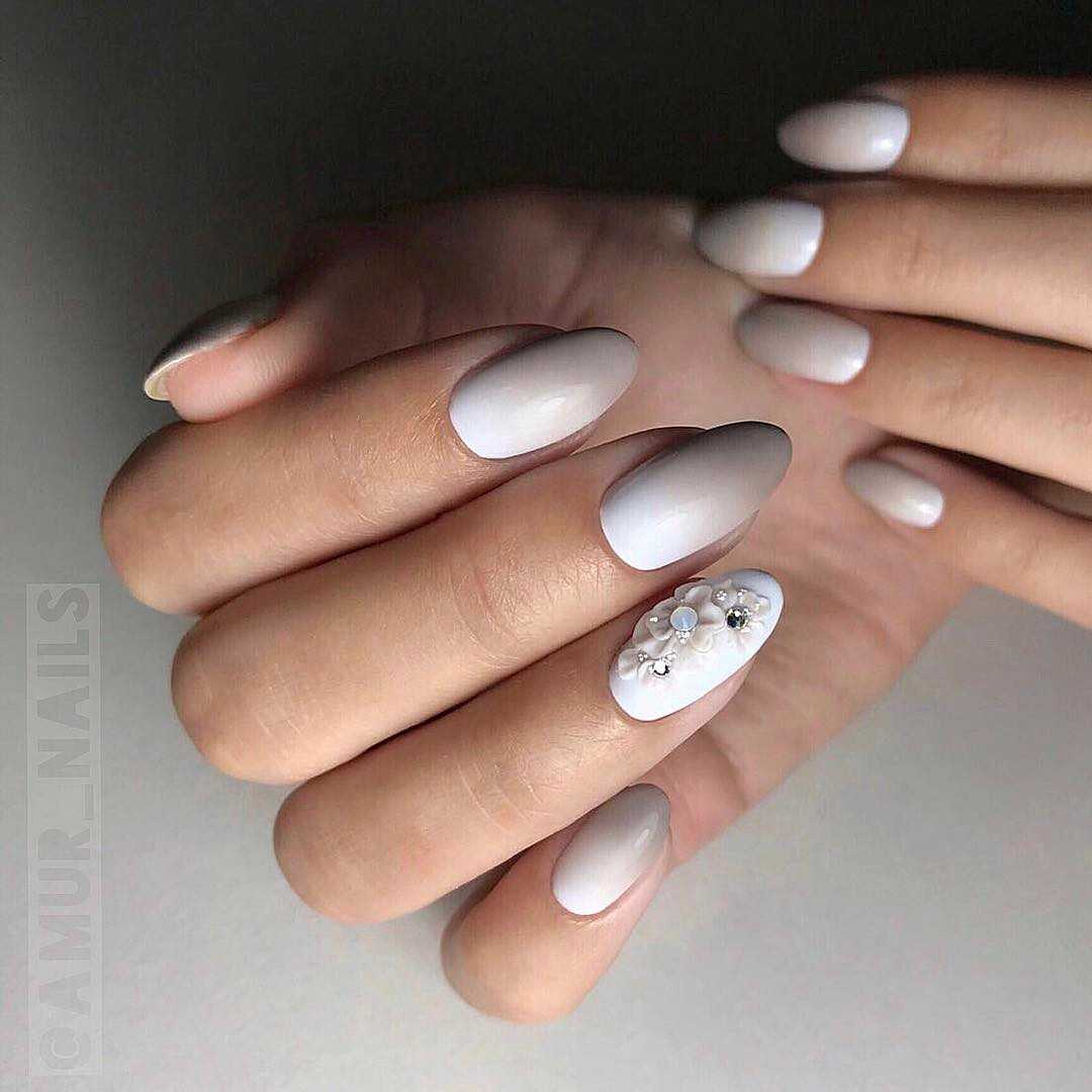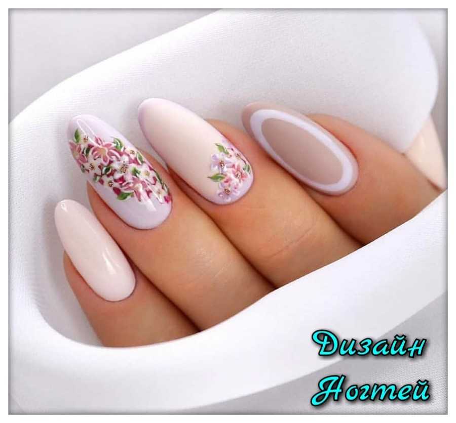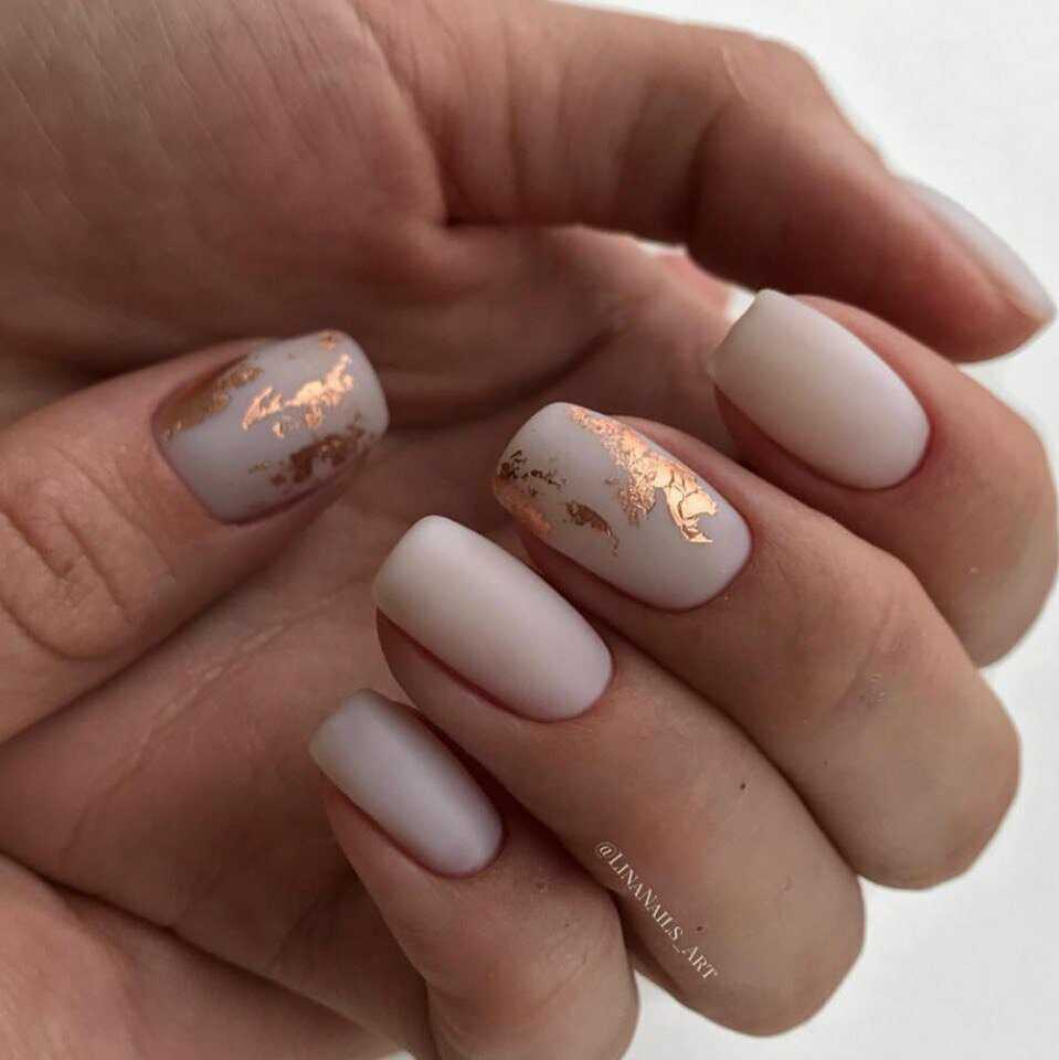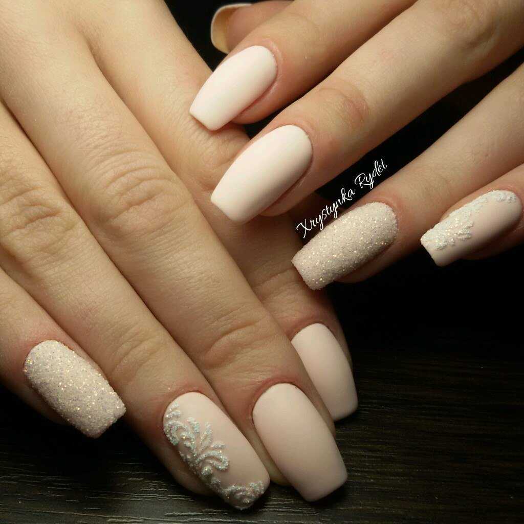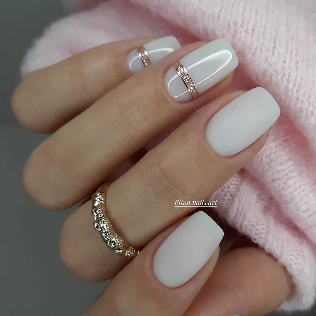 Матовый маникюр в молочном воспроизведении прекрасно гармонирует с лиловыми и розовыми оттенками. Экспериментируйте с пастельной палитрой, а также не забывайте про эффектное сочетание с блестящими акцентами.