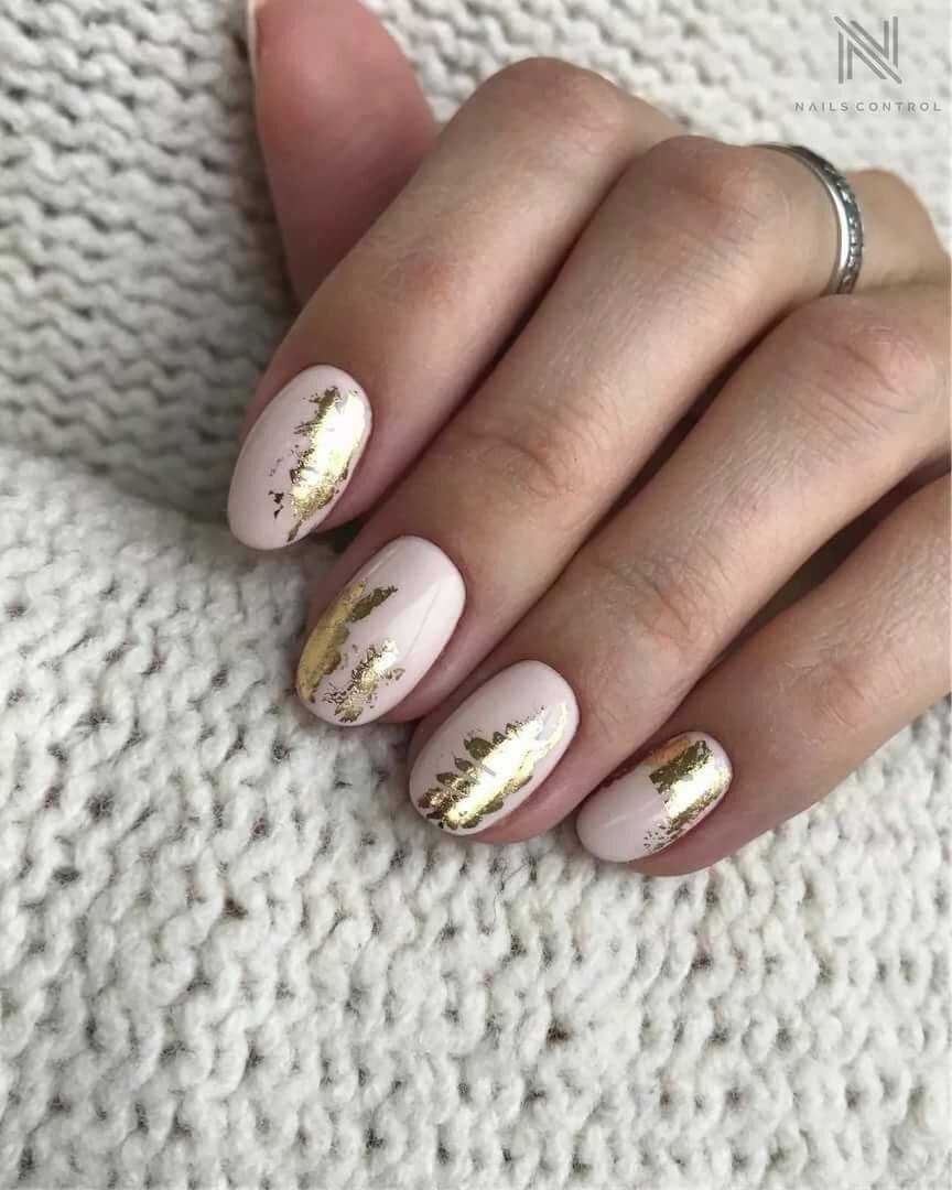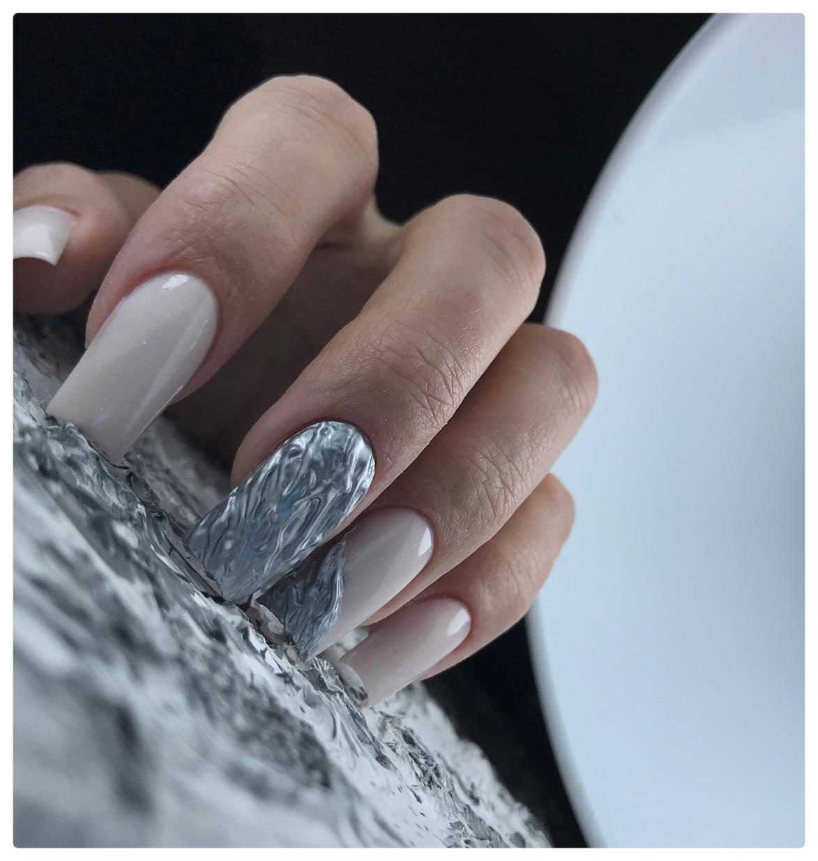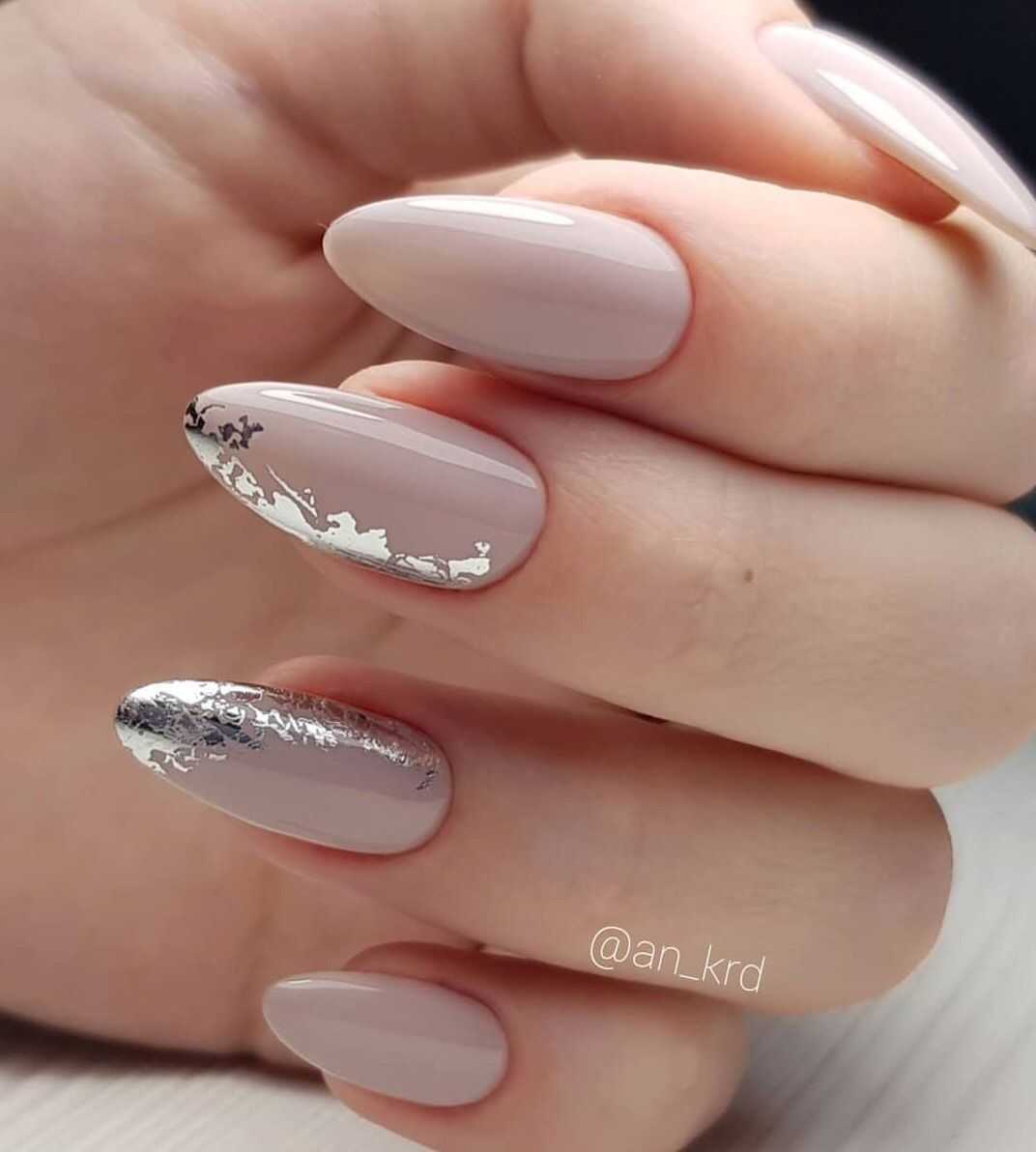 Фольга — самый трендовый вариант декора ногтей. Для выполнения праздничного дизайна пригодятся эти очень тонкие металлические пластины. Они могут быть разных оттенков: платинового, золотого, медного, изумрудного, рубинового и других. Если аккуратно нанести на покрытие один элемент из фольги, то можно получить красивый переливающийся орнамент разных форм и очертаний.