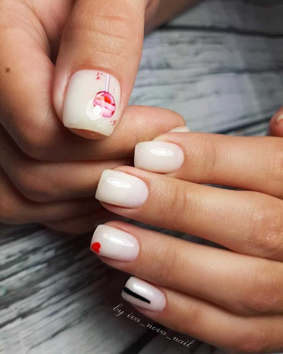 - С мороженым. Чаще всего для изображения мороженого используются нежно-кремовые, светлые оттенки, но их можно смело комбинировать с более веселыми и яркими элементами на других ногтях. Лучше всего для таких рисунков подходят глянцевые лаки и втирка.