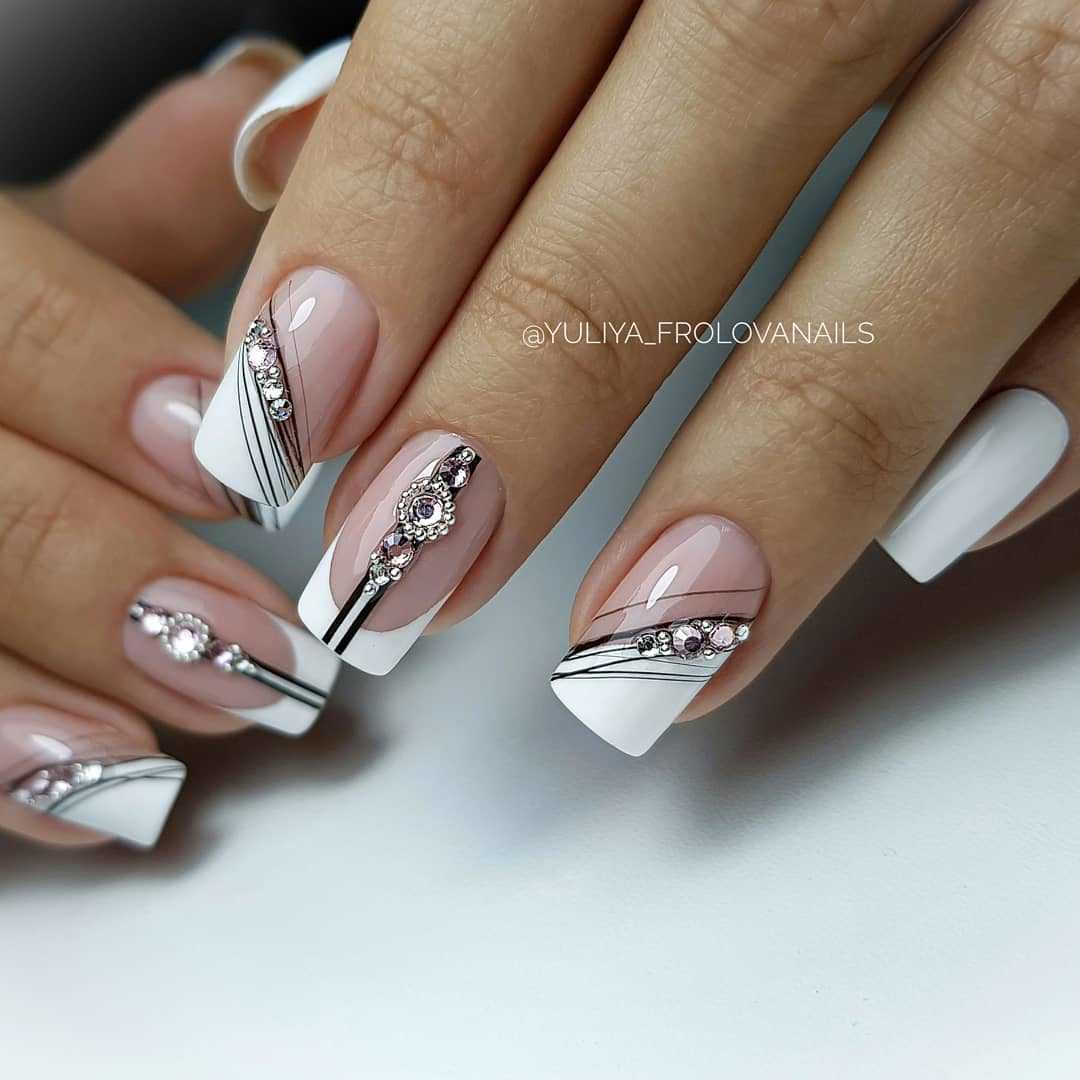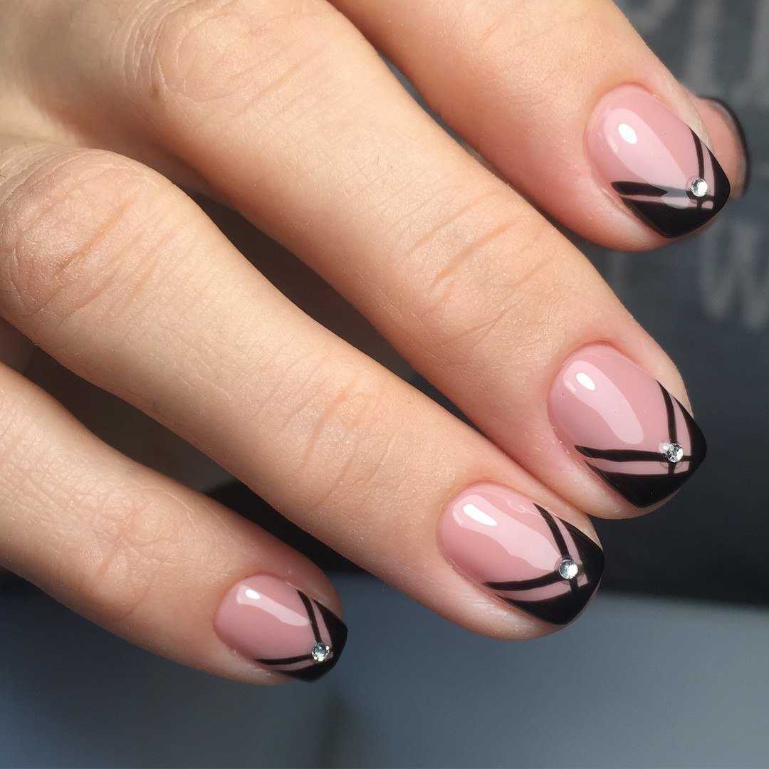 Выложенная стразами линия улыбки френча, или прикорневой лунки лунного маникюра, можно придать акцент паре ноготков, выложив стразами геометрический орнамент или уложить пару капелек в уголках ноготков.