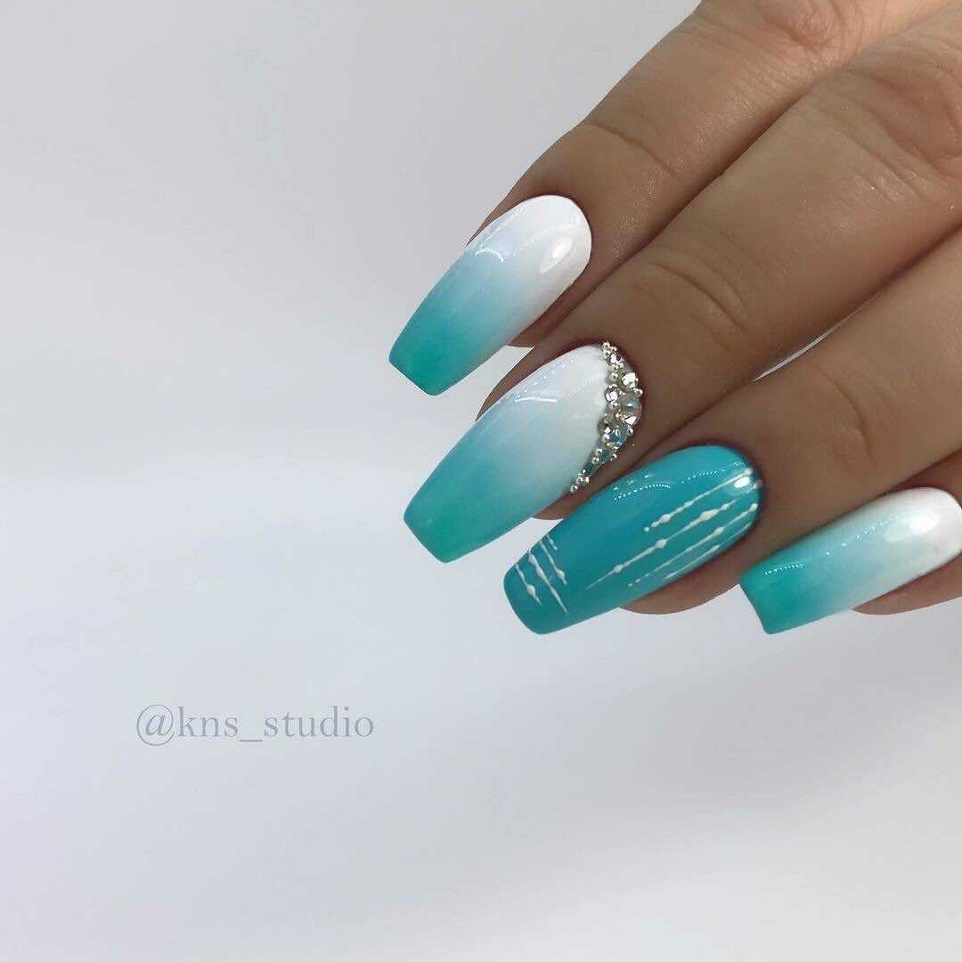 Нежные пастельные оттенки выглядят очень женственно и красиво. Стильные мятные дизайны весьма разнообразны и представлены в классических вариантах с техникой омбре, сочетающей различные рисунки и украшения.