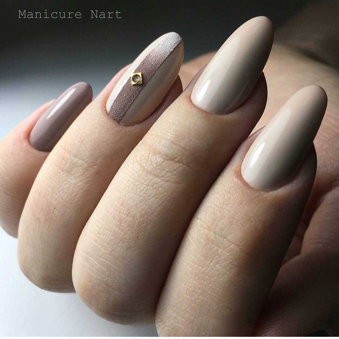 Если вы хотите придать своему образу деловой и солидный вид, то, выбирая коричневый или бежевый маникюр с блестками, как на фото, рекомендуется воспользоваться теплыми тонами песочно-коричневой палитры. При этом необходимо знать, что следует наносить одинаковый лак или полностью на всю ногтевую пластину, или чередуя его темным и светлым тоном. На сегодняшний день такой дизайн маникюра отличается повышенной актуальностью и сможет еще несколько сезонов продержаться в тренде.