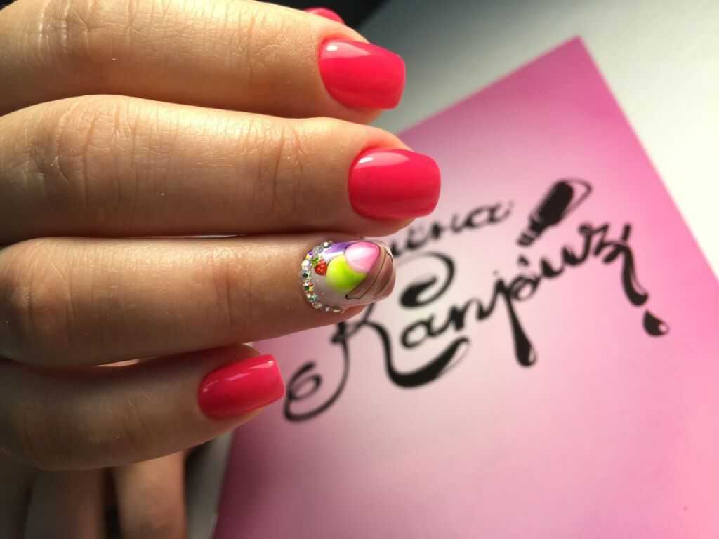 Благодаря гибкости современных тенденций, на ногтях можно воплотить практически любую необычную идею, в том числе рисунки с разнообразными сладостями. С таким маникюром сочетается практически любой современный летний образ, а особенно – пляжные костюмы.