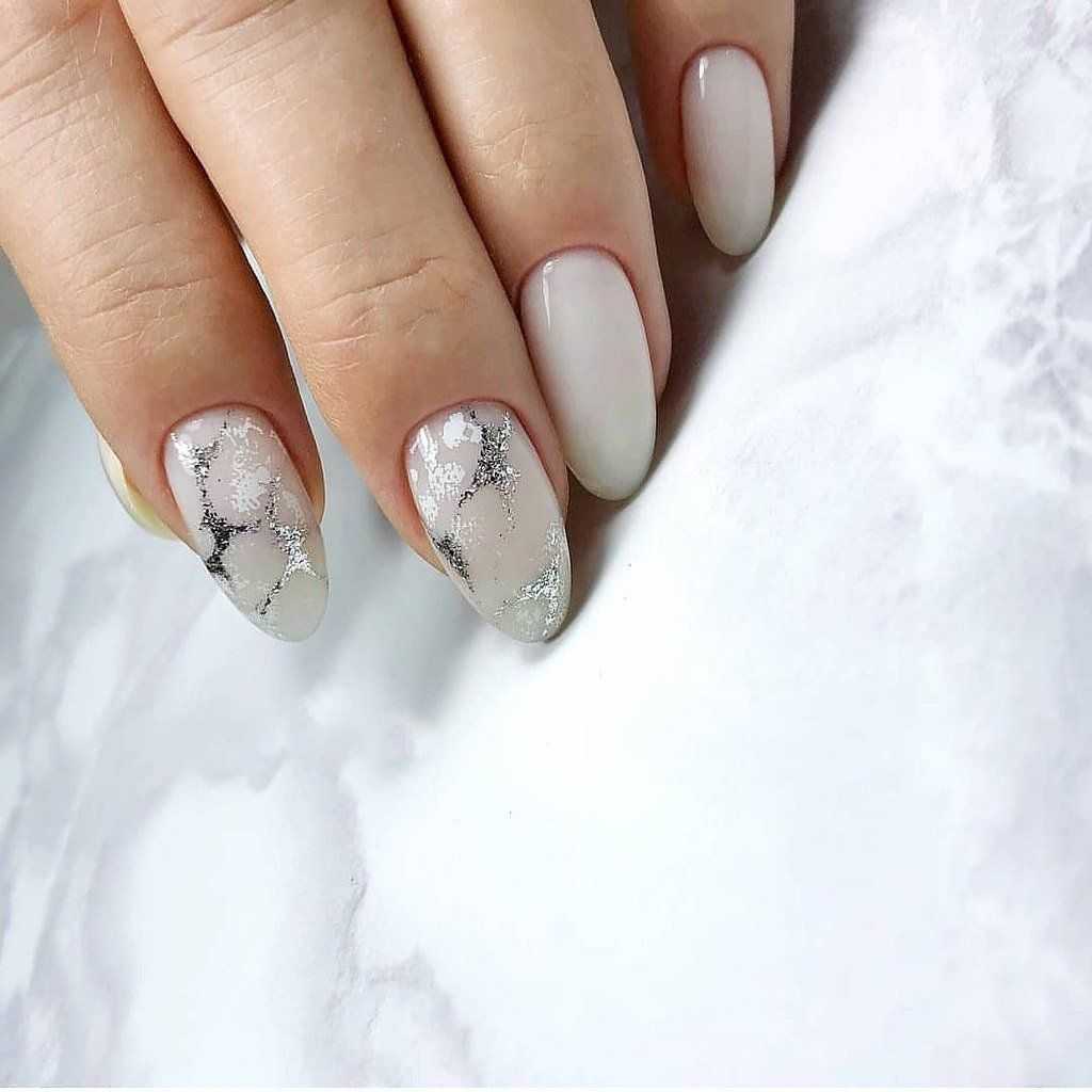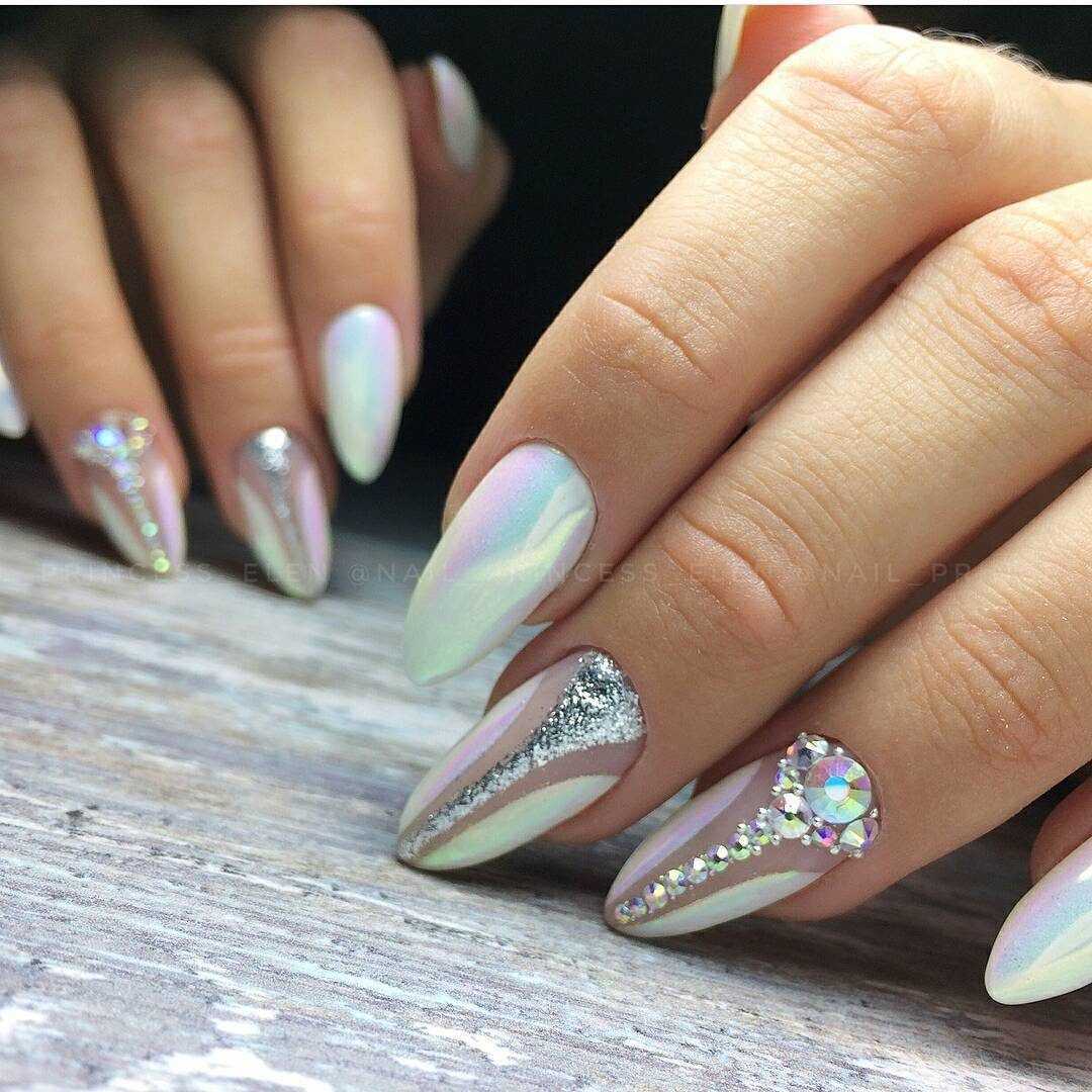 Зимний маникюр украшается волнистыми блестящими линиями, гирляндами кусочков потали, фольги, стразинками. Особенно эффектно смотрится жемчужная или радужная втирка, она визуально создает объем, глубину перелива. А также серебряный кошачий глаз, если сделать рассеянный 3d блик, и не собирать частички в полоску.